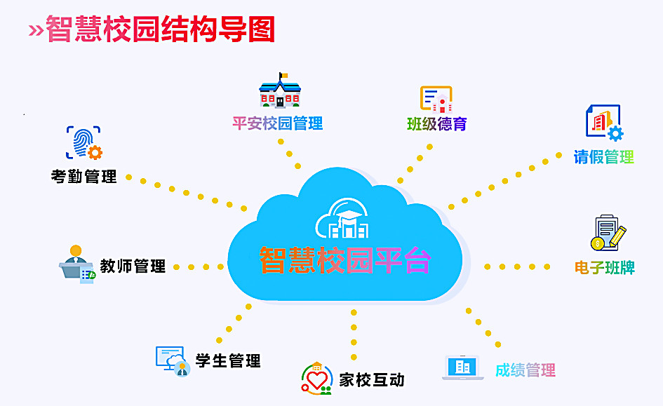 智慧校园通常由以传感器网络及智能硬件为核心的校园基础设施和部署在数据中心内云端服务器上的智慧化软件系统构成 ,常见功能可分为智慧教学环境、智慧教学资源、智慧校园管理、智慧校园服务四大板块