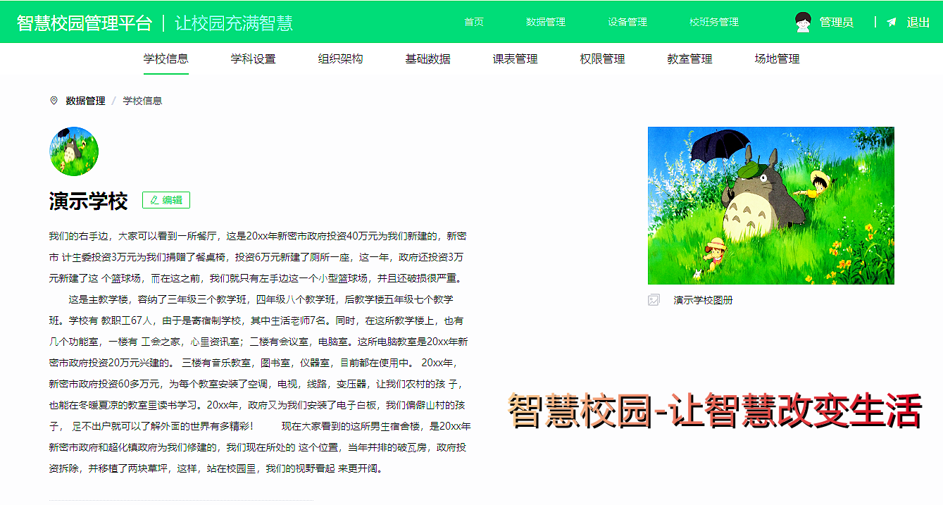 1、学校信息:支持管理员对学校对基本学校信息进行编辑并浏览,通过编辑提交后全校可查看