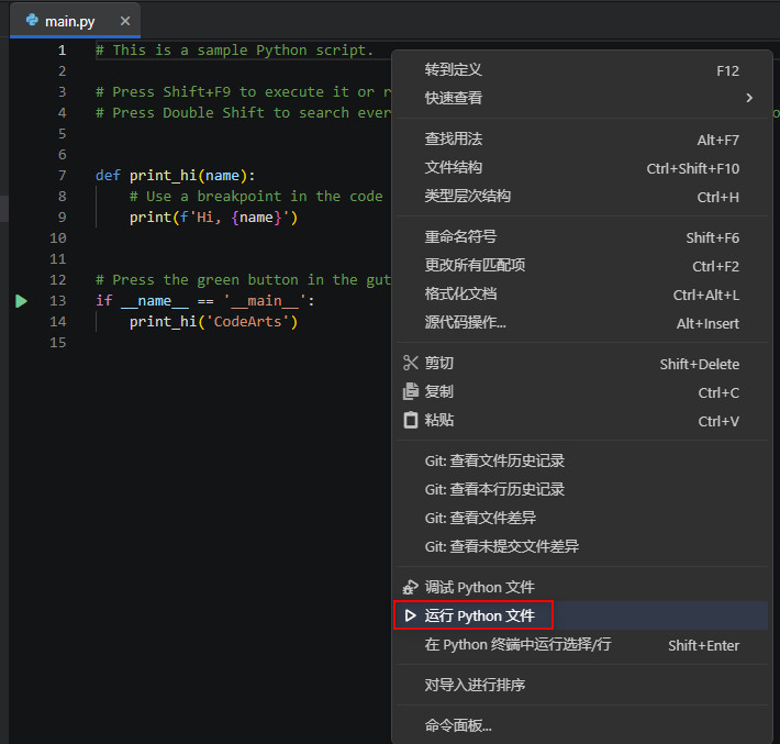 ),以启动内置的“当前文件”启动配置。 - 在代码编辑器的任意位置右键单击,并选择“运行 Python 文件”。如果您在选定的代码块上调用此命令,则可以仅运行该部分代码。