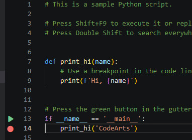 对于快速开始项目,您可以在 "main.py" 文件的第 14 行设置一个断点。将光标悬置在 “print_hi” 调用上,然后按下 “F9” / “Ctrl+Shift+B” / “Ctrl+F8”(IDEA快捷键)。您也可以通过单击编辑器左侧的行号旁的空白区域来设置断点。