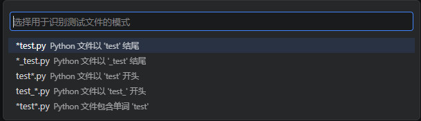 - 下一个对话框中,选择用于标识测试文件的文件通配符模式,本例中为 \“*test.p\”。