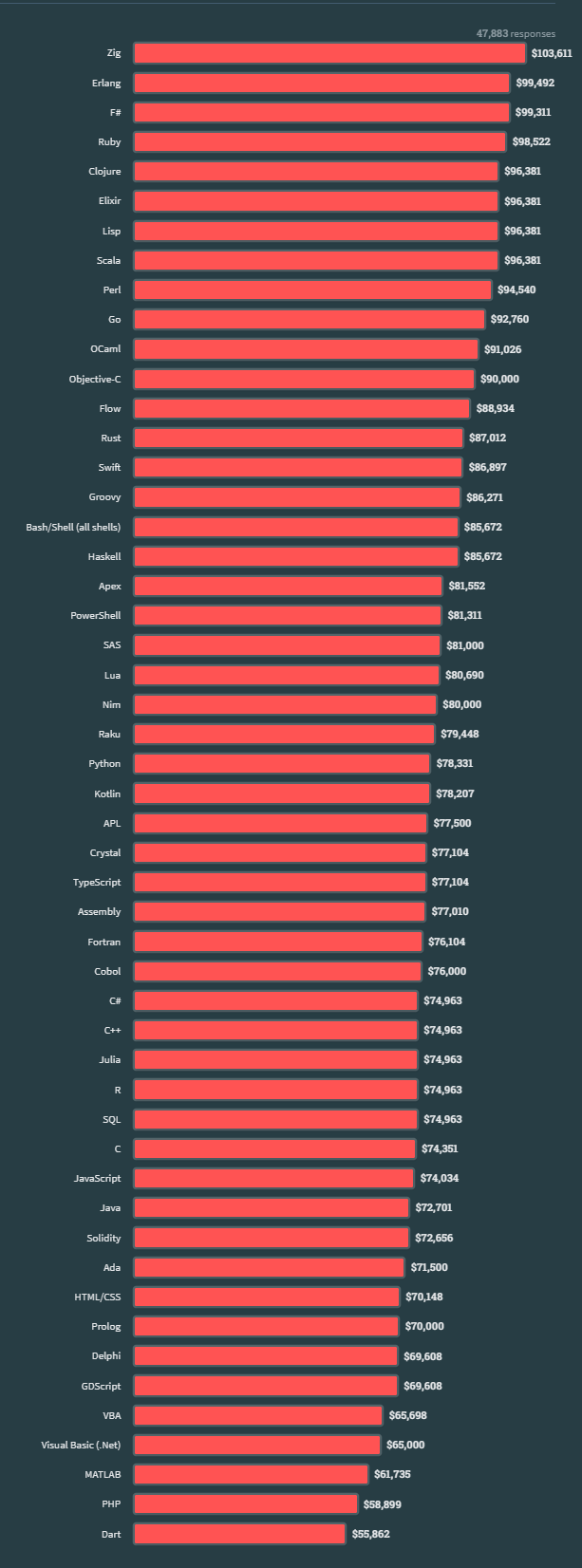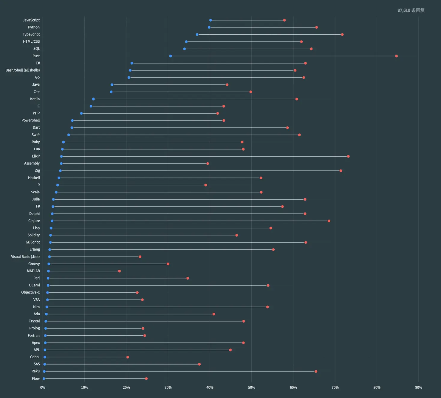 这份榜单中可以看到Clojure、kotlin是明显更受欢迎的。