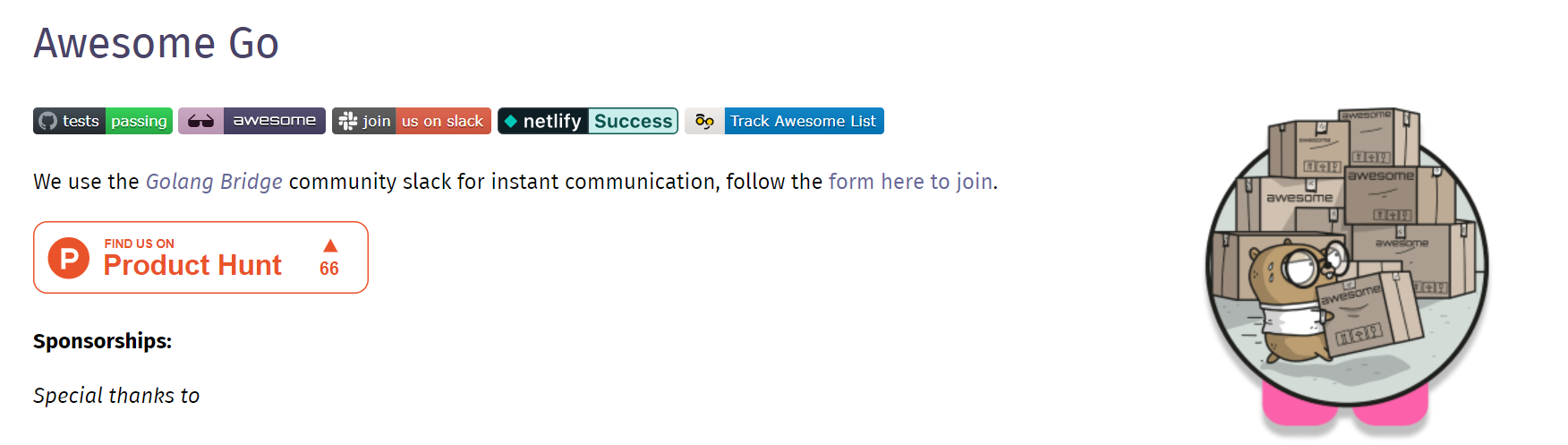 想要省时省力寻求 Go 项目的话,首推 Awesome Go——Go 编程语言的百科全书。庞大的项目库,包含了大量优质的 Go 框架、第三方库和软件。