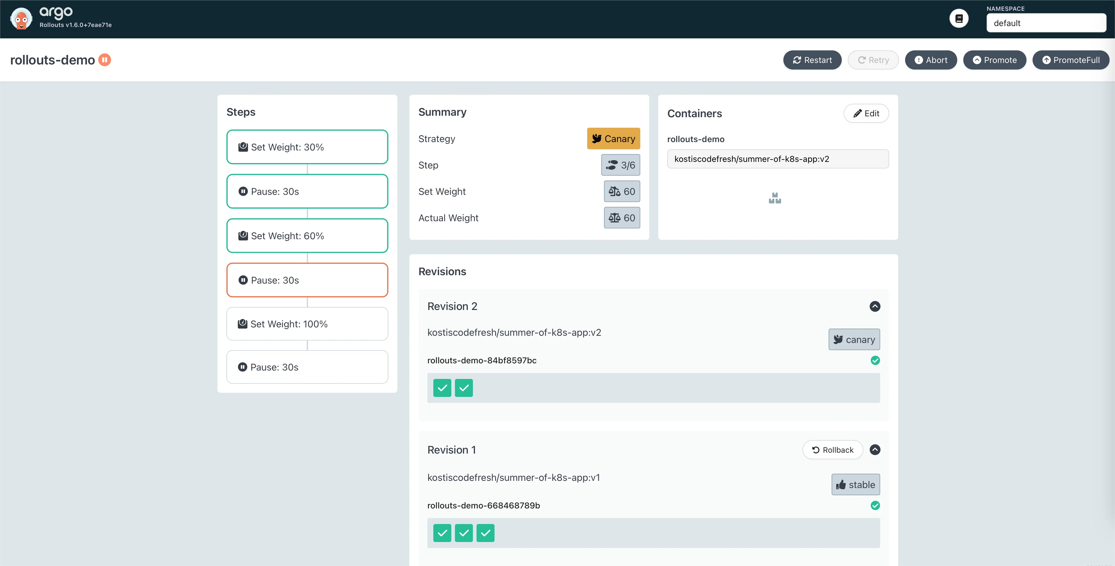 当然,在 Argo Rollouts 的 Dashboard 中我们可以更加直观地看到 Rollout 的执行流程。