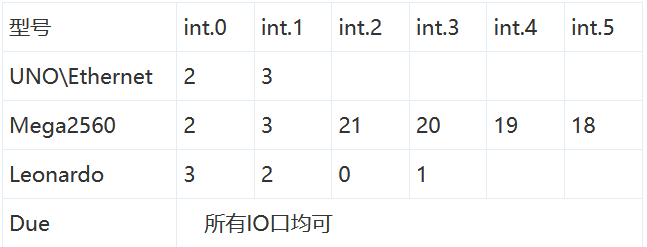 外部中断在不同的Arduino型号上位置也不同,只有外部中断发生在以下端口,Arduino才能捕获到,以下例举了常见的几种型号的外部中断引脚标号。
