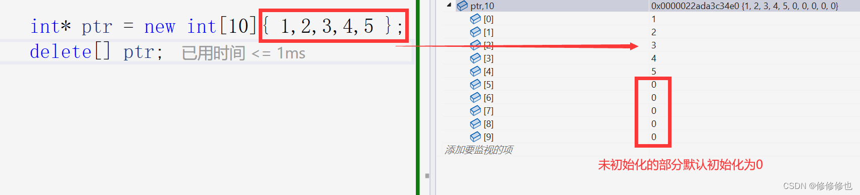 默认情况下,动态分配的对象是默认初始化的,这意味着内置类型或组合类型的对象的值将是未定义的,如果我们想要在动态分配时就直接将空间初始化,则需要使用传统的构造方式(使用圆括号),如: