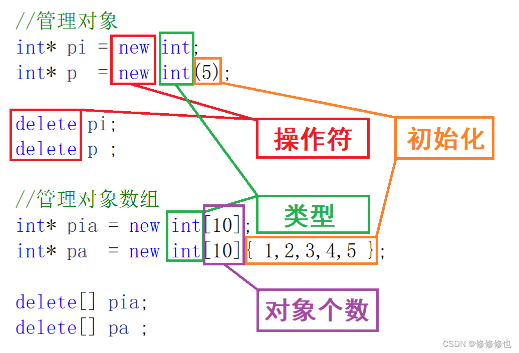 • new,在动态内存中为对象分配空间并返回一个指向该对象的指针,我们可以选择对对象进行初始化;