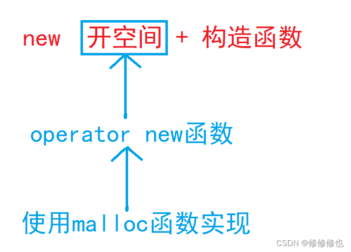 new的功能是开空间+调用构造函数,而开空间的这部分功能可以使用malloc来完成,但是malloc在设计时采用的报错方式是返回错误码,这和C++中的报错方式——抛异常不符,因此就使用malloc函数按照C++的报错方式专门封装了一个用来开空间的函数——operator new,由它来接替malloc函数完成开空间的任务.如下图: