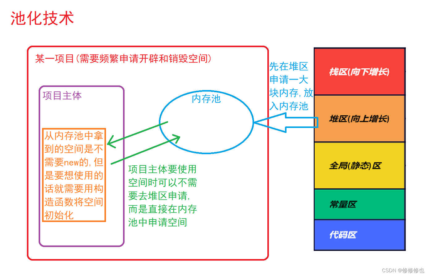 定位new表达式在实际中一般是配合内存池使用。因为内存池分配出的内存没有初始化,所以如果是自定义类型的对象,需要使用new的定义表达式进行显示调构造函数进行初始化.(主要是为了减少项目频繁的直接从堆上开辟/销毁空间,从而提高效率)