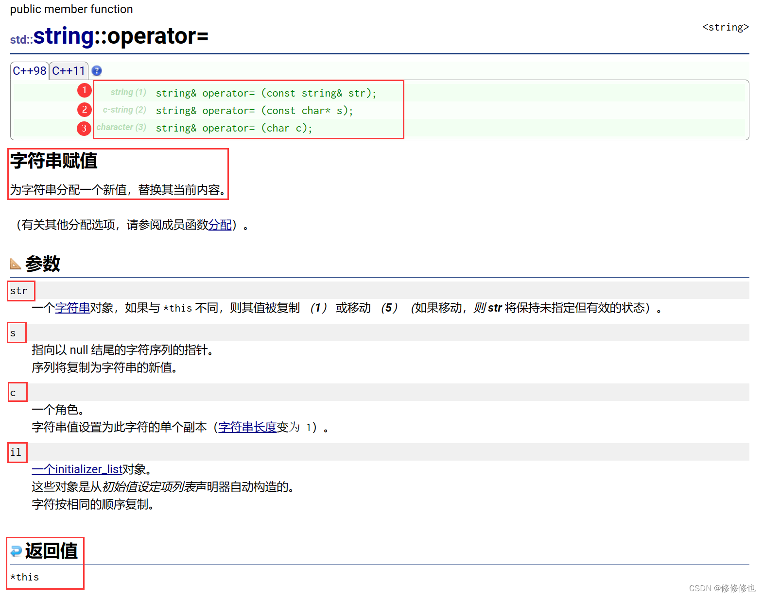 如下,C++98标准中对于string类实现了3个重载的赋值运算符重载函数: