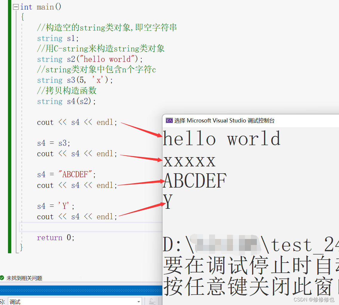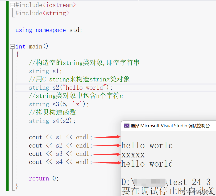 如下代码,分别按上述构造函数顺序调用了相应构造函数初始化了4个string类对象:
