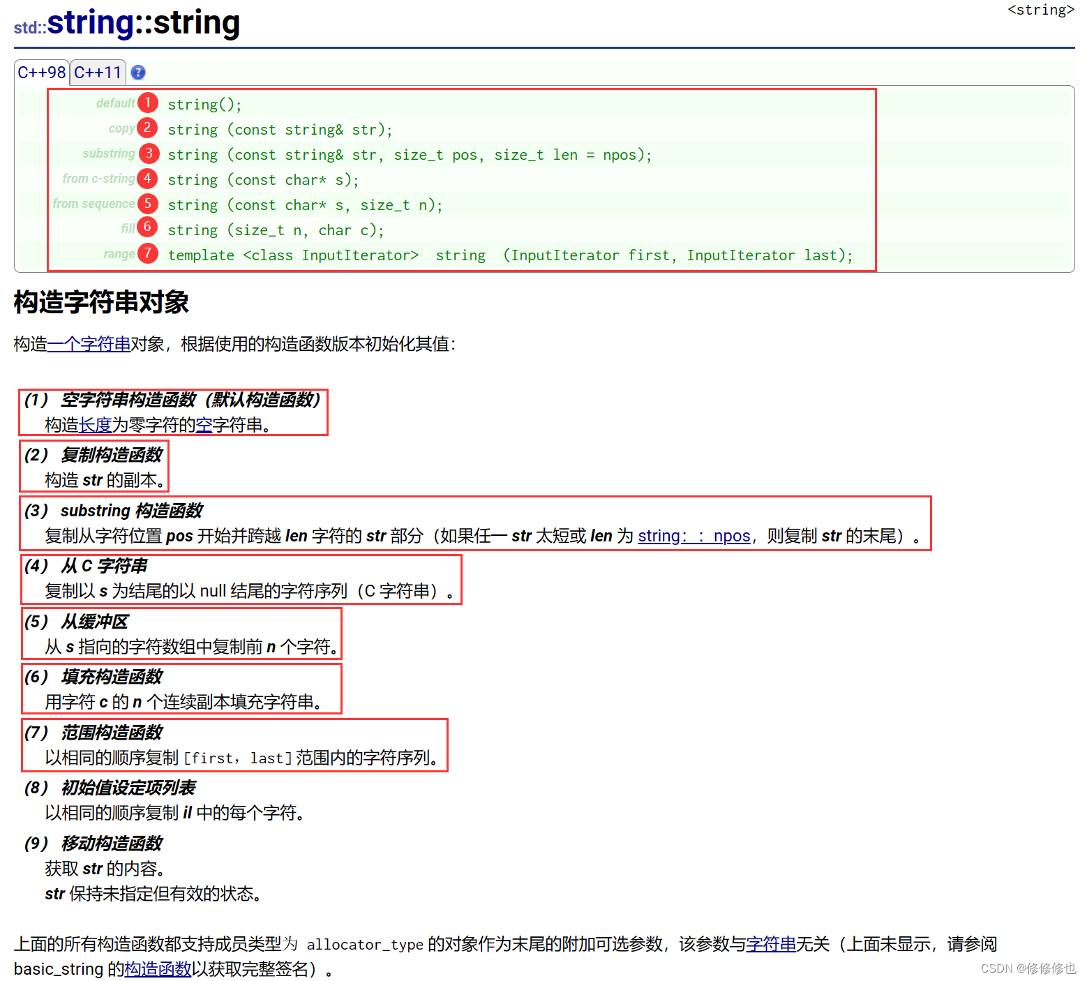 如下,C++98标准中对于string类实现了7个重载的构造函数:string类查询文档