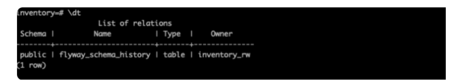 Flyway 使用 spring 数据源配置来查找数据库,将数据库的详细信息添加到我们的应用程序中。这里,我创建了一个名为 inventory 的数据库和一个名为 inventory_rw 的 R/W 用户,我们的应用程序配置如下所示: