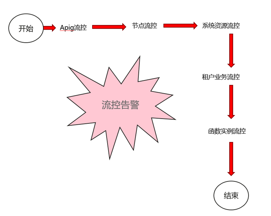 客户流量通过APIG后,走到FunctionGraph的系统侧。基于APIG流控失效的场景,FunctionGraph构建了自身的流控策略。当前支持节点级别流控、客户api总流控、函数级别流控。当客户流量超过FunctionGraph的承载能力时,系统直接拒绝,并返回429给客户。