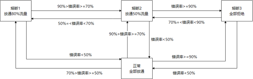 上面的种种措施,可以保障客户业务平稳运行,但当客户业务出现异常一直无法恢复或者有恶意客户持续攻击FunctionGraph平台,系统资源会一直浪费在异常流量上,挤占正常客户的资源,同时系统可能会在持续高负荷运行异常流量后出现不可预期的错误。针对这种场景,FunctionGraph基于函数调用量模型构建了自身的断路器策略。具体如图6所示,根据调用量的失败率进行多级熔断,保证客户业务的平滑以及系统的稳定。