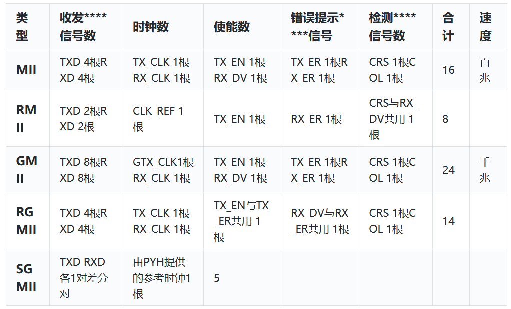 常见网络信号模式包含:MII、RMII、GMII、RGMII、SGMII。每种模式包含的信号线数量和控制线数量各不相同,通讯速度也不相同:MII、RMII为百兆网络,GMII、RGMII、SGMII为千兆网络。区别和关系可以参考表2.2和图2.5。各模式工作原理可根据我们的视频进行详细了解。