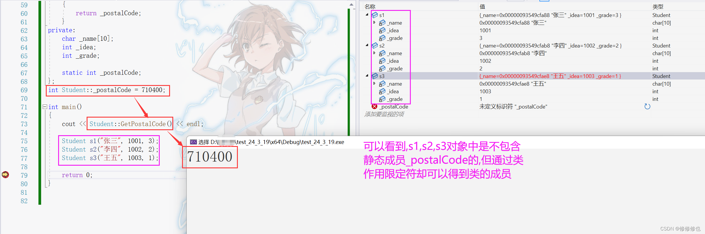 1. 静态成员为所有类对象所共享,不属于某个具体的对象,存放在静态区。如下代码:
