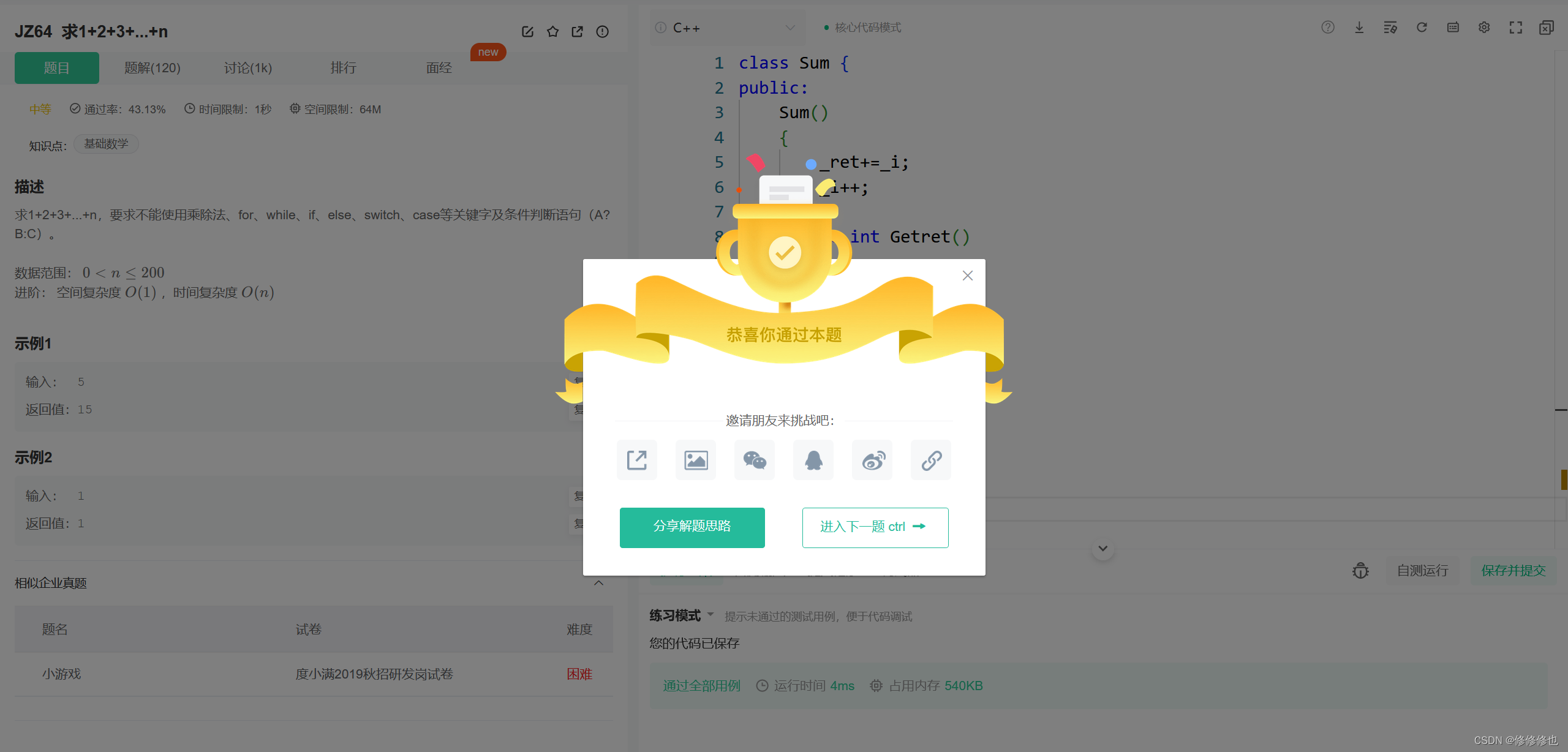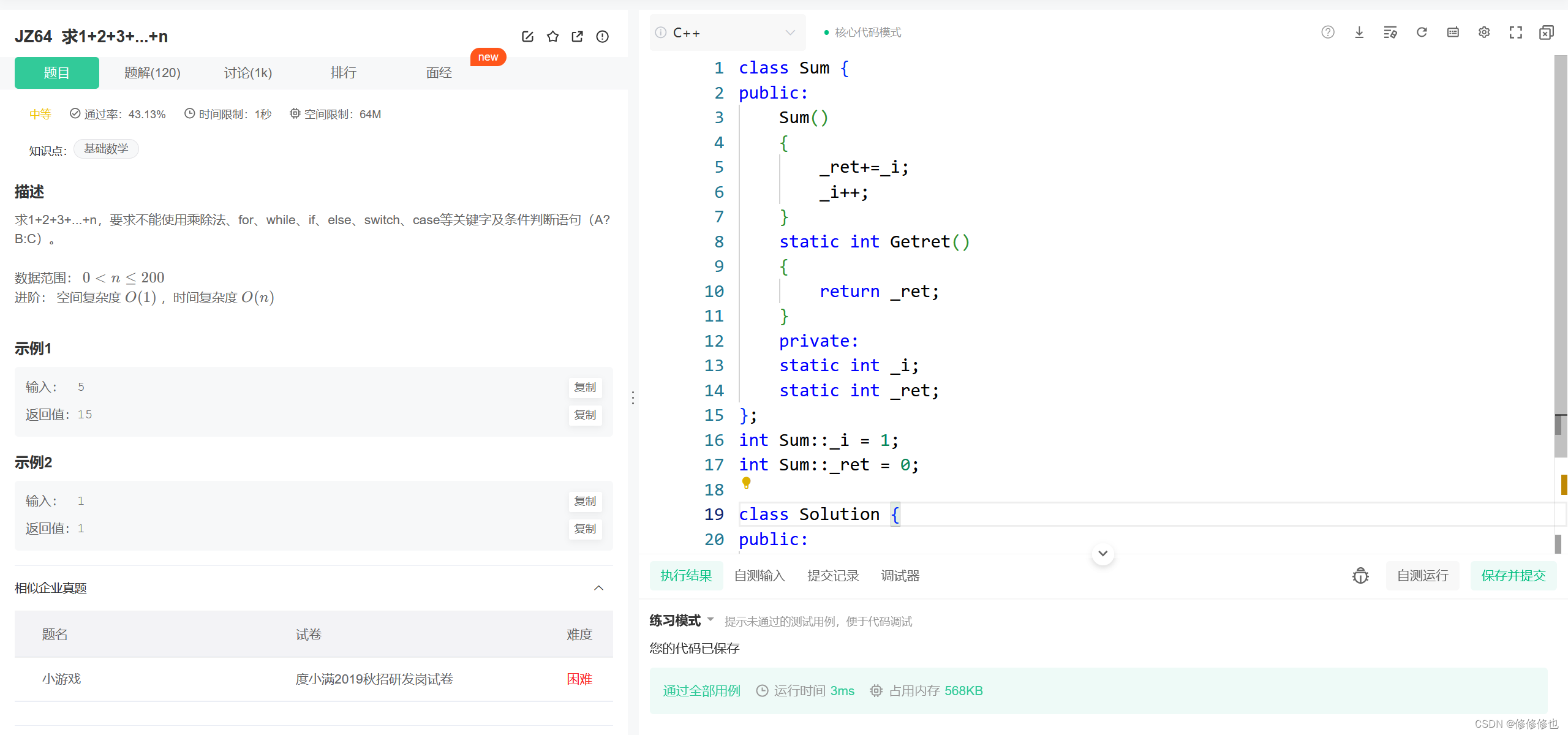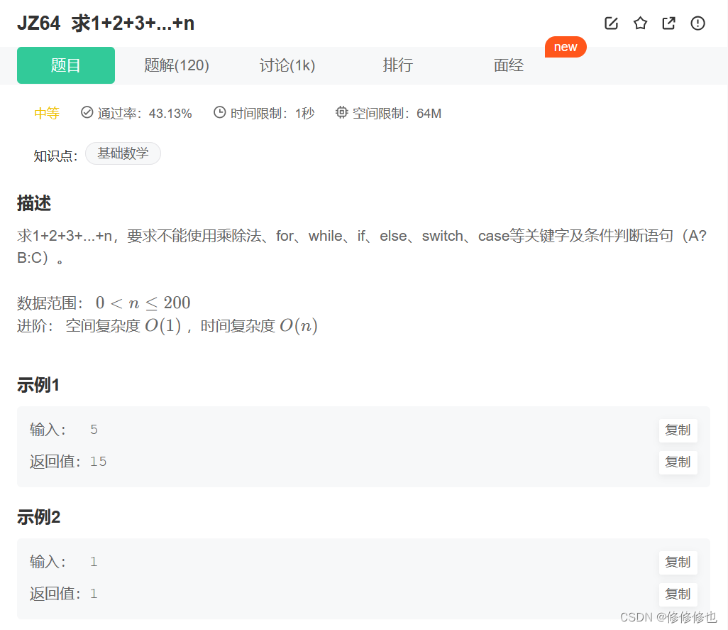 牛客网题目链接:JZ64 求1+2+3+...+n