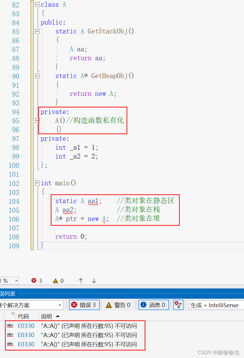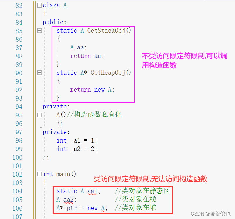 2.使用成员函数来创建类对象是因为成员函数调用类函数不受访问限定符的限制,如: