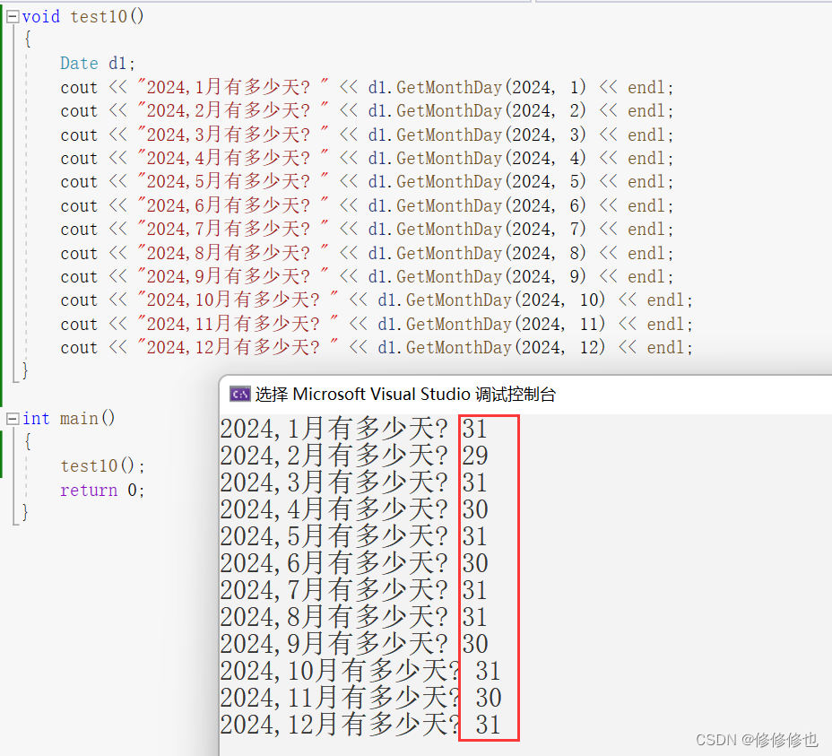 cout << "2024,10月有多少天? " << d1.GetMonthDay(2024, 10) << endl;