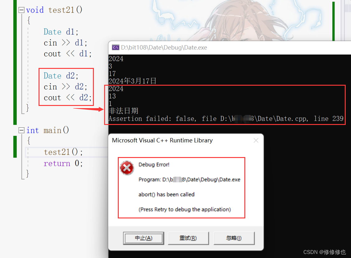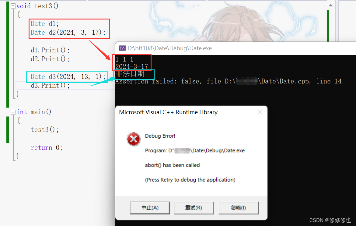如下,我们在主函数创建两个类d1,d2和非法值d3,分别测试一下构造函数的功能: