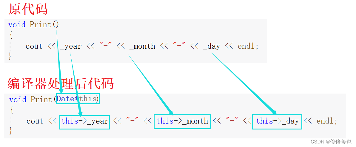 C++中通过引入this指针解决该问题,即:C++编译器给每个“非静态的成员函数“增加了一个隐藏的指针参数,让该指针指向当前对象(函数运行时调用该函数的对象),在函数体中所有“成员变量”的操作,都是通过该指针去访问。只不过所有的操作对用户是透明的,即用户不需要来传递,编译器自动完成。