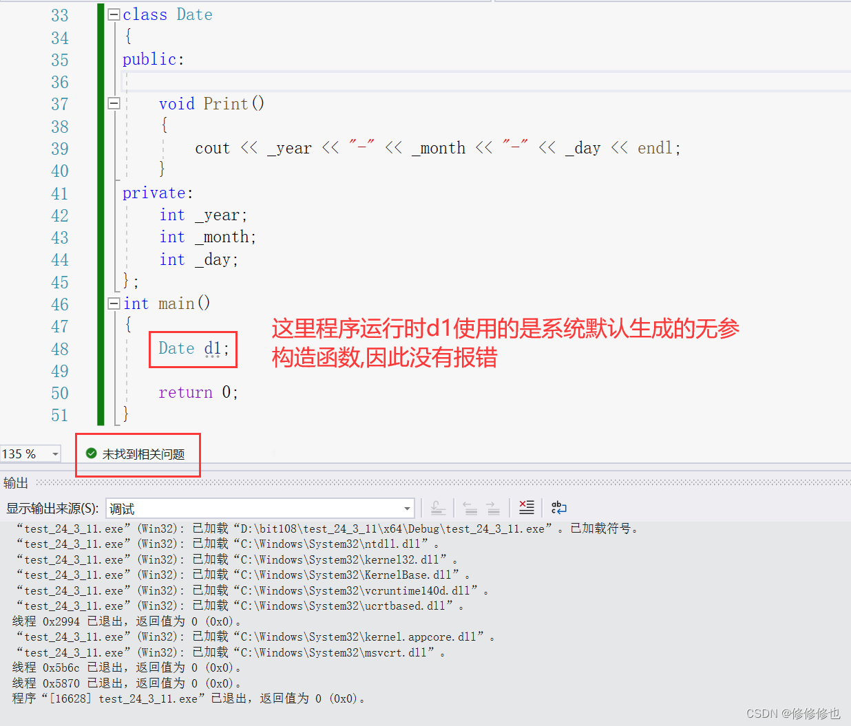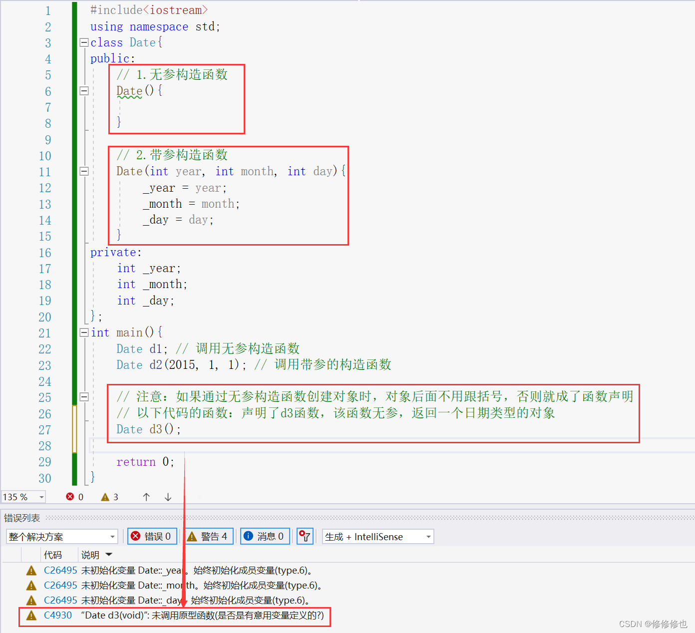 如:我们先创建一个日期类Date,但不写构造函数,且在主函数调用无参构造函数: