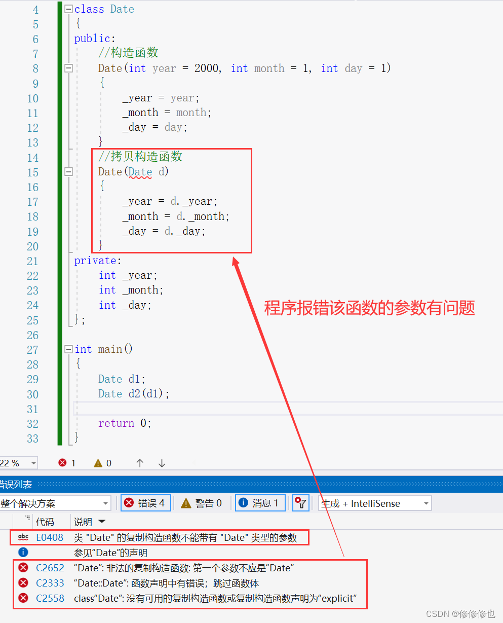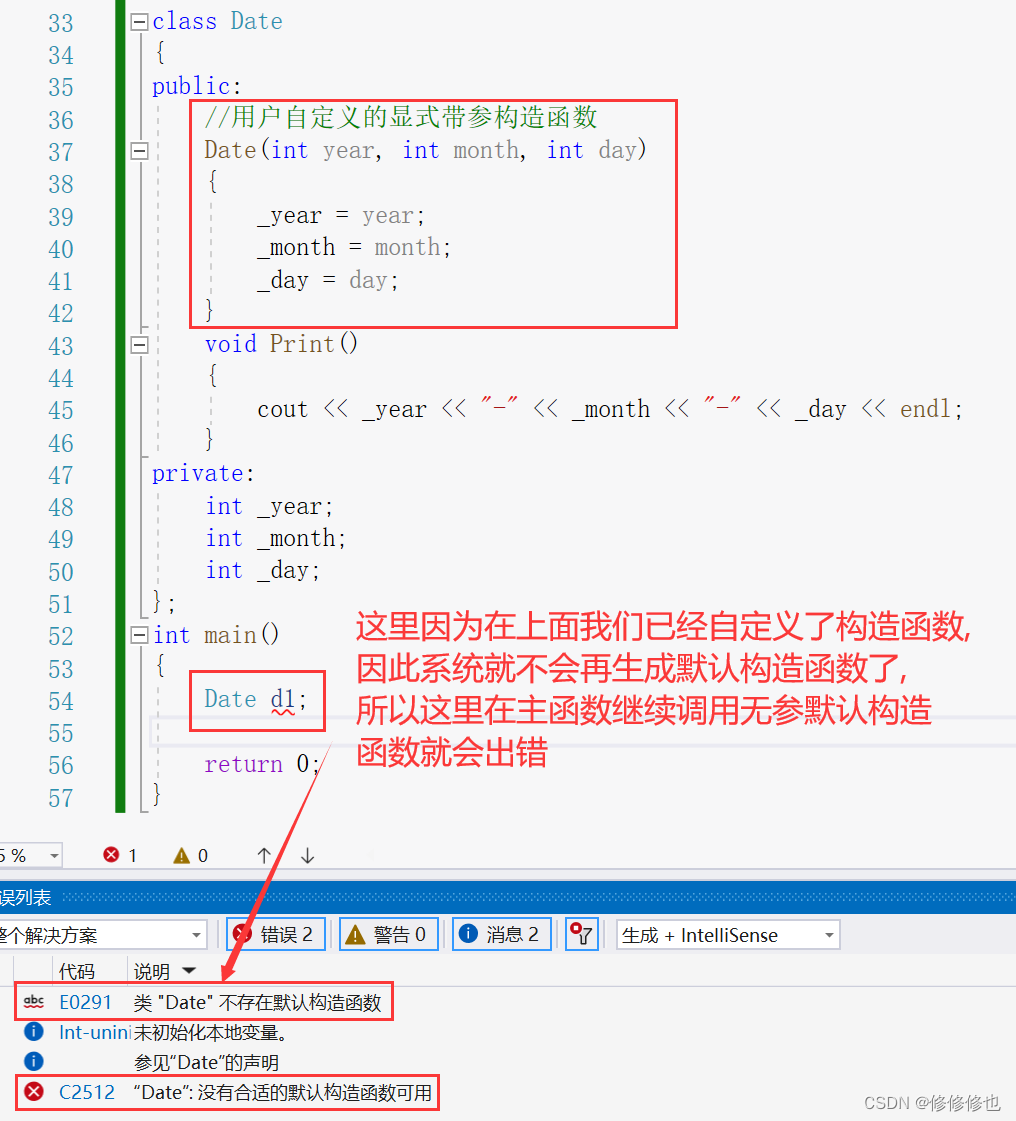 但是如果当我们显式自定义了构造函数,系统就不会再生成那个无参的构造函数了,这时我们再在主函数调用无参的构造函数就会失败: