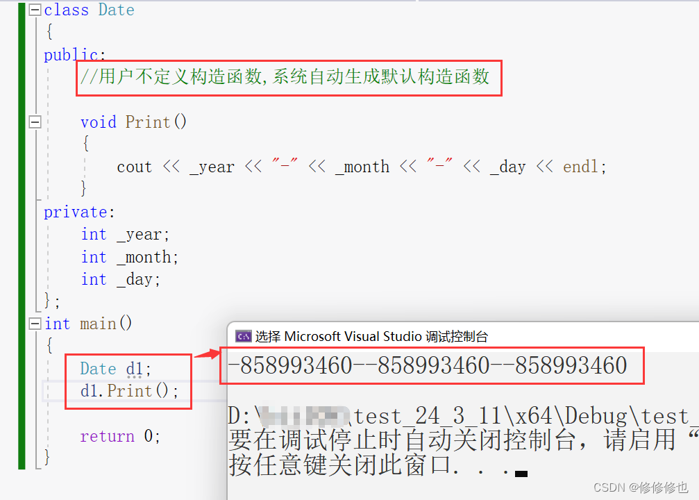 6.关于编译器生成的默认成员函数,不实现构造函数的情况下,编译器会生成默认的构造函数。但是看起来默认构造函数好像又没什么用。如下代码,d1对象调用了编译器生成的默认构造函数,但是d1对象_year/_month/_day,依旧是随机值:
