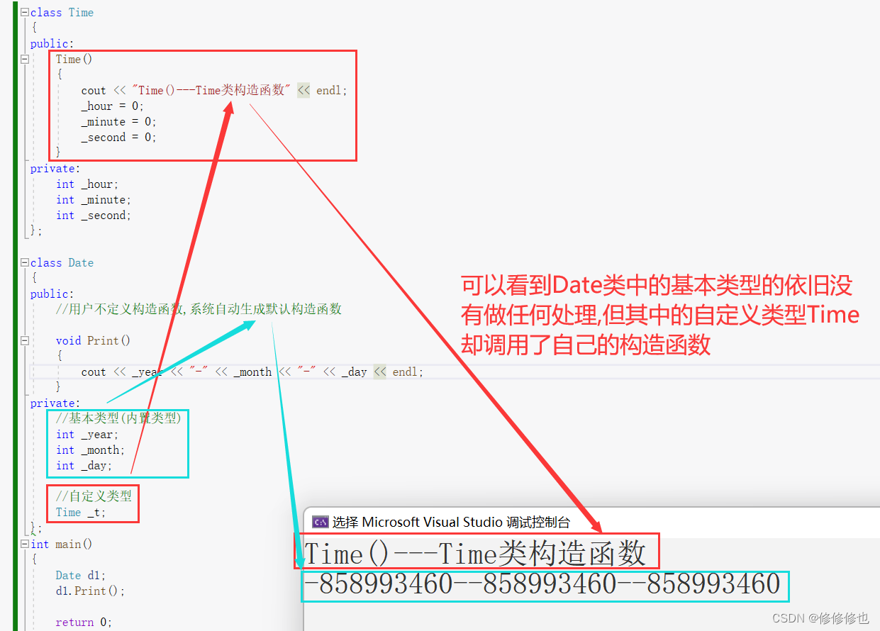 其实不是的,C++把类型分成内置类型(基本类型)和自定义类型。内置类型就是语言提供的数据类型,如:int/char...,自定义类型就是我们使用class/struct/union等自己定义的类型,看看下面的程序,就会发现编译器生成默认的构造函数会对自定类型成员_t调用的它的默认成员函数。