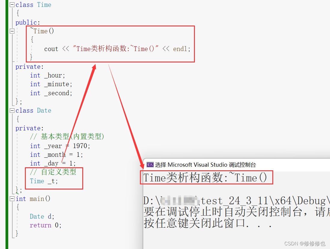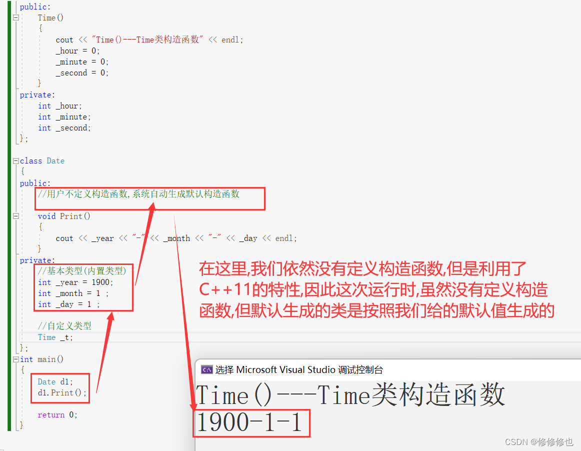 注意:C++11 中针对内置类型成员不初始化的缺陷,又打了补丁,即:内置类型成员变量在类中声明时可以给默认值。