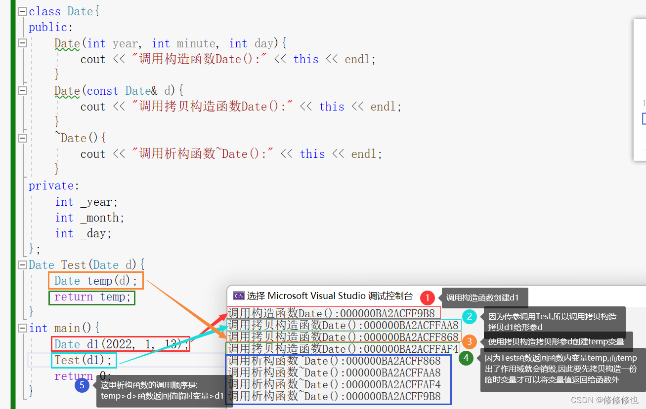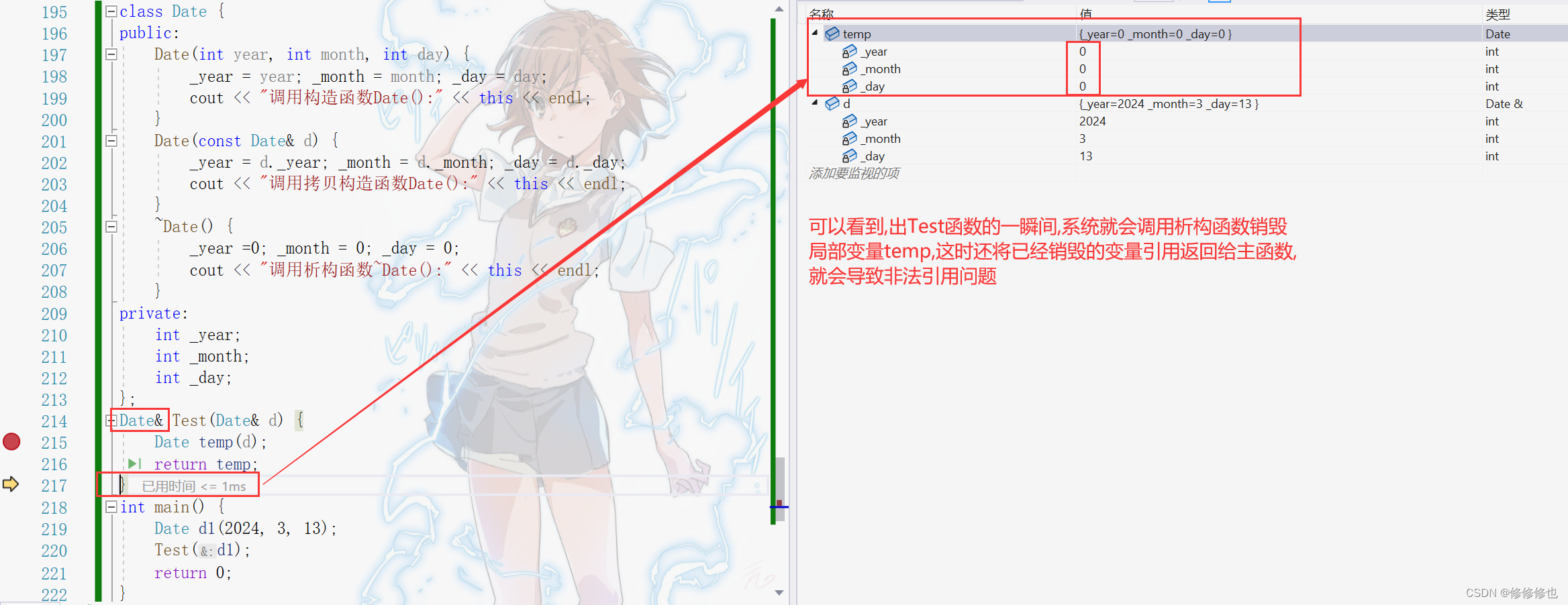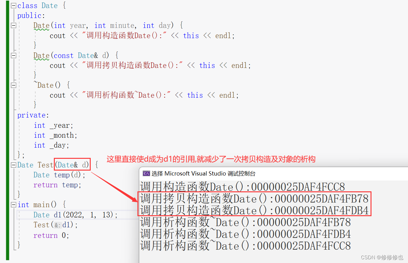 但还有一点需要注意,不能够将函数内部创建的变量通过引用返回值返回给主函数,因为该变量出了函数就会调用析构函数销毁,返回给主函数的就会是一个非法的无效引用,如下Date类:
