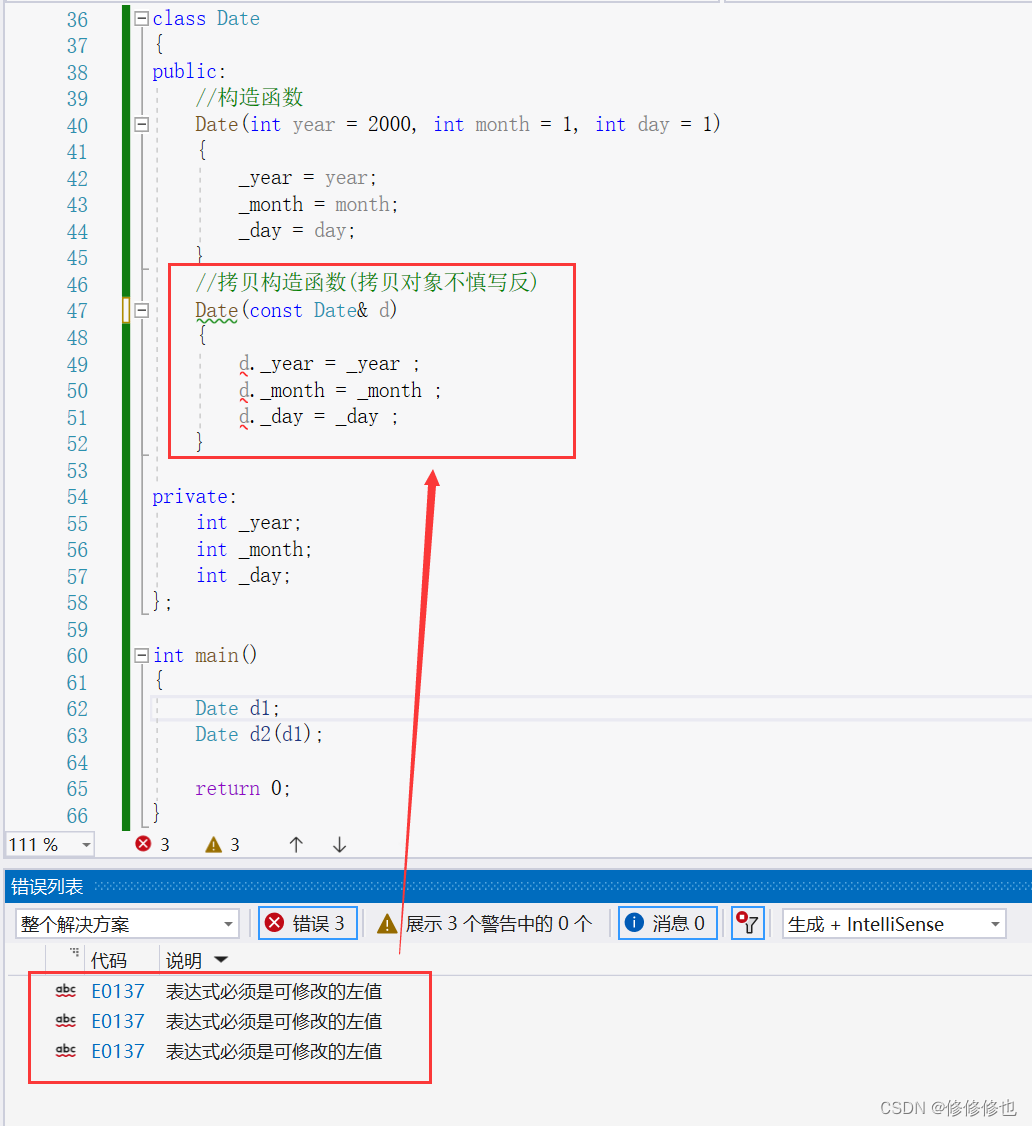 这时如果函数返回值为void,则d3后的'='运算符就没有右运算数了,为了兼容这种情况,我们可以将函数的返回值设置为调用函数的变量,这样就可以满足连等的操作了。其次使用类引用做返回值的原因是,因为调用该函数的变量生命周期一定不在函数范围内,即出了函数作用域后不会导致该变量被销毁,因此使用引用返回值是安全的,并且还可以节省一次返回值拷贝构造的开销,从而提升函数效率。