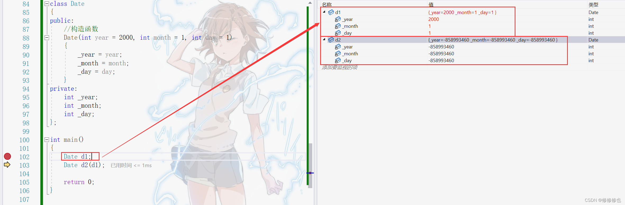 Date d2(2015, 1, 1); // 调用带参的构造函数