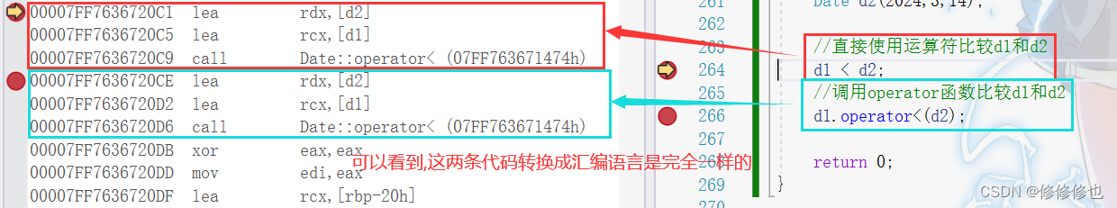 经过测试,我们可以看到,在使用operator重载了<之后,直接使用运算符比较和调用operator<函数比较的代码转为汇编代码后是完全一模一样的: