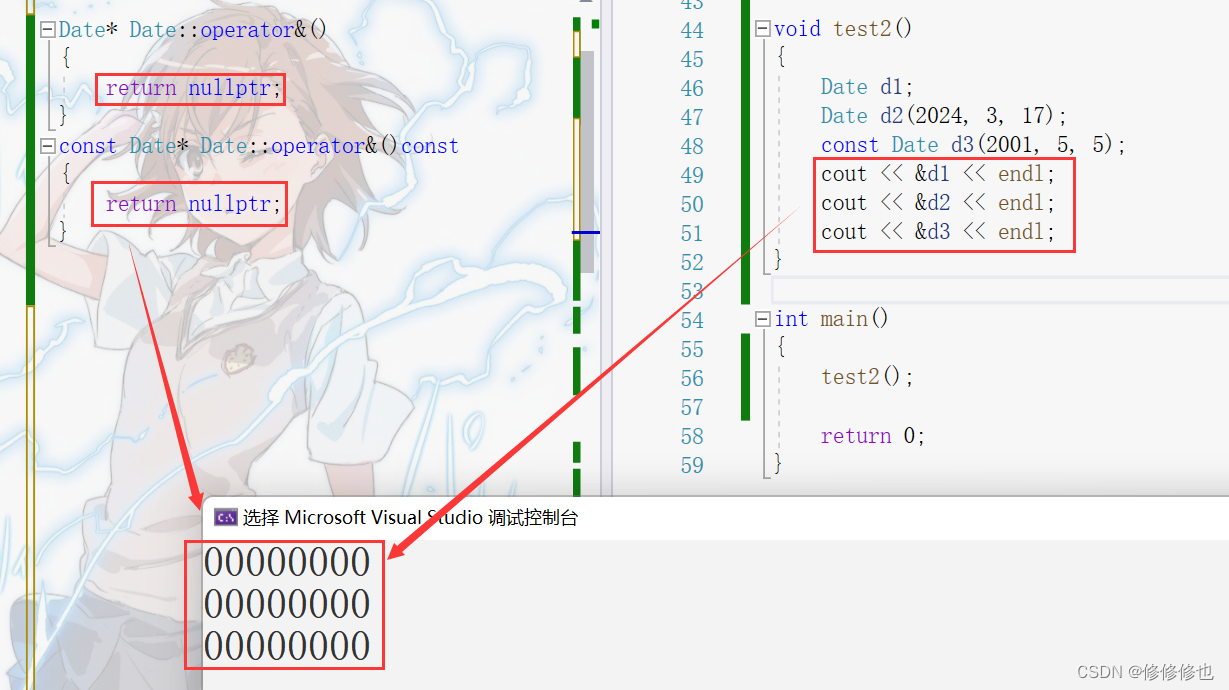 const取地址操作符重载是取地址操作符的一种重载形式,但它的作用主要是为被const修饰的变量获取它的const修饰的地址,因为要出入保持一致,否则如果传入一个const变量,但却返回了一个不是const修饰的地址,就会导致该变量有被利用地址强行修改的风险,因此Date类const取地址操作符重载函数如下: