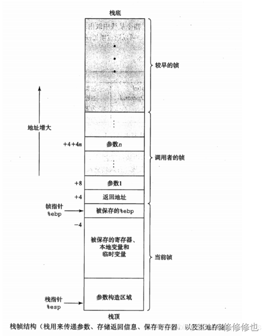当某个函数运行时,机器需要分配一定的内存去进行函数内的各种操作,这个过程中分配的那部分栈称为栈帧。下图描述了栈帧的通用结构。栈帧是一段有界限的内存区间,由最顶端的两个指针界定,寄存器%ebp为基址指针寄存器(extended base pointer),而寄存器%esp为栈指针寄存器(extended stack pointer)(也就是说寄存器%ebp保存了所分配内存的最高地址,寄存器%esp保存了所分配内存的最低地址)。当程序执行时,栈指针(栈顶)可以移动,因此大多数信息的访问都是相对于桢指针的。