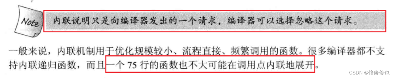• inline对于编译器而言只是一个建议,不同编译器关于inline实现机制可能不同,一般建议:将函数规模较小(即函数不是很长,具体没有准确的说法,取决于编译器内部实现)、不是递归、频繁调用的函数采用inline修饰,否则编译器会忽略inline特性。下图为《C++prime》第五版关于inline的建议: