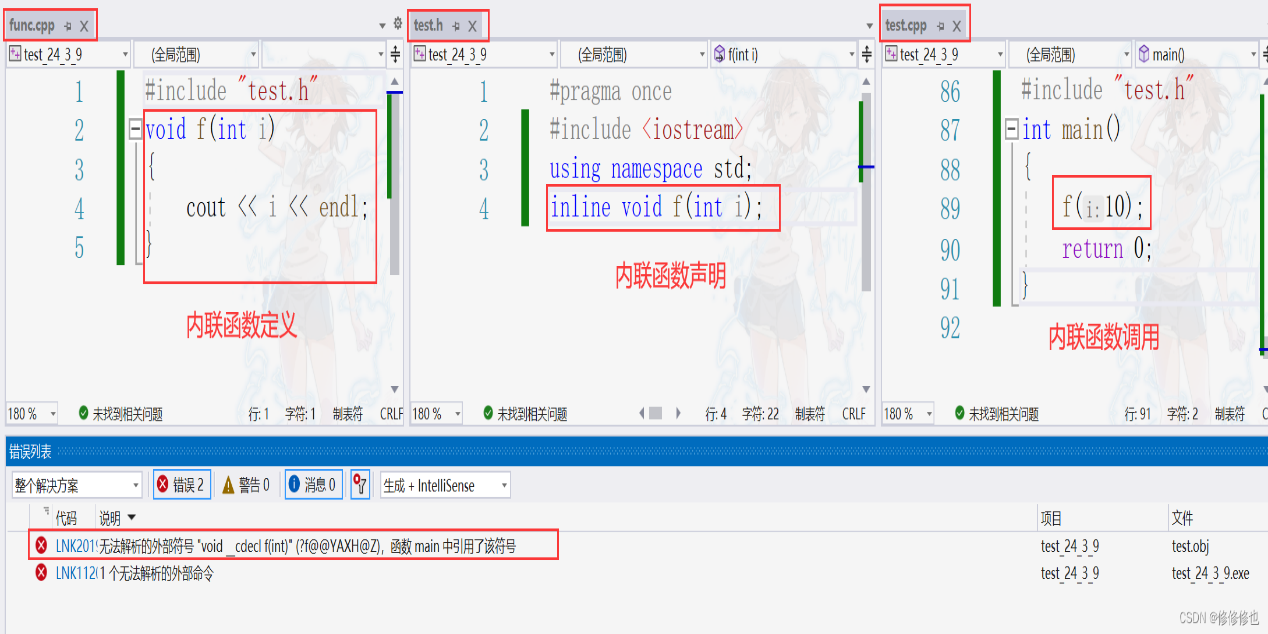 • inline不建议声明和定义分离,分离会导致链接错误。因为inline被展开,就没有函数地址了,链接就会找不到。如: