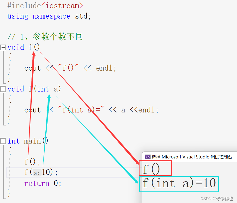 可以看到,因为在主函数调用f()函数时,我们分别给f()函数传0个参数和一个整形参数,因为构成函数重载,所以这两条语句分别调用执行了不同的函数.