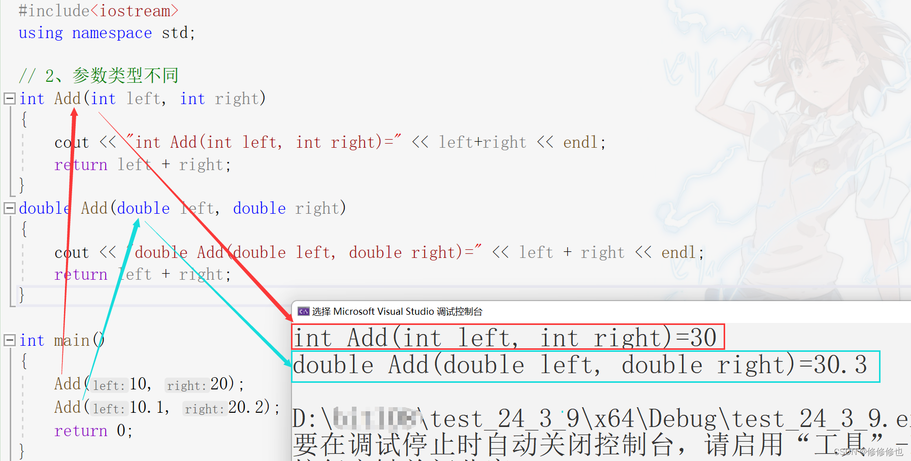 如下,我们创建两个同名函数Add(),其中第一个函数需要两个整形作为参数,第二个函数需要两个双精度浮点数作为参数,因为这两个函数参数类型不同,因此构成函数重载: