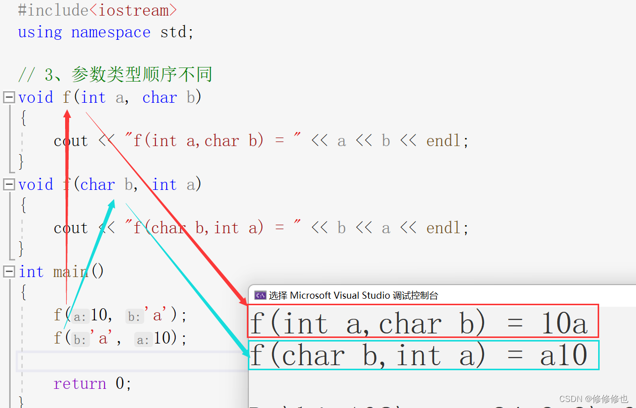 可以看到,因为在主函数调用f()函数时,我们分别给f()函数传第一个参数是整形,第二个参数是字符型以及第一个参数是字符型,第二个参数是整形做为参数,因为构成函数重载,所以这两条语句分别调用执行了不同的函数.