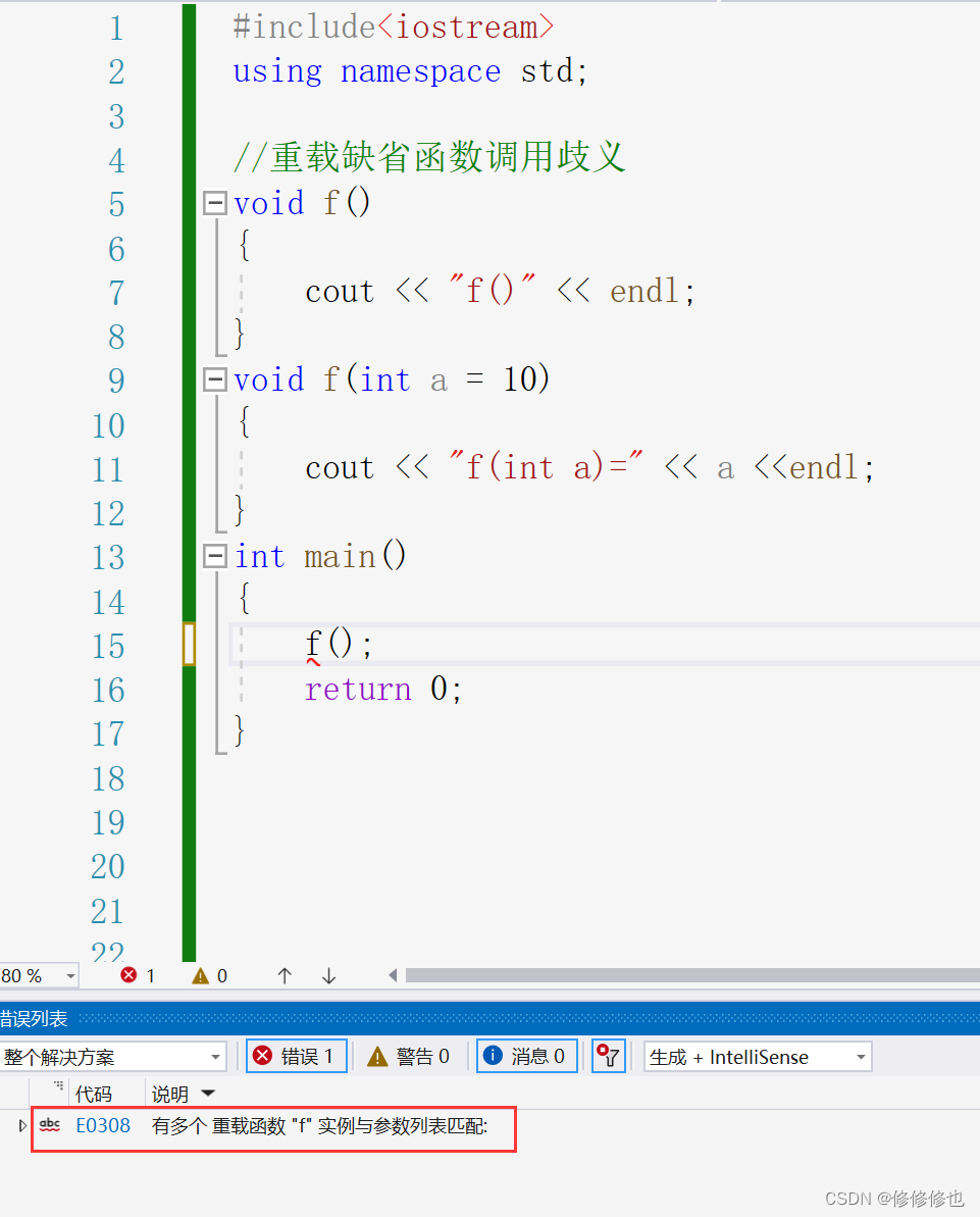 在之前,我们一起学习过C++中缺省参数的概念:【C++】缺省参数(默认参数) ,而在使用缺省参数构成重载函数时,要特别注意其是否会引起以下函数调用歧义的情况: