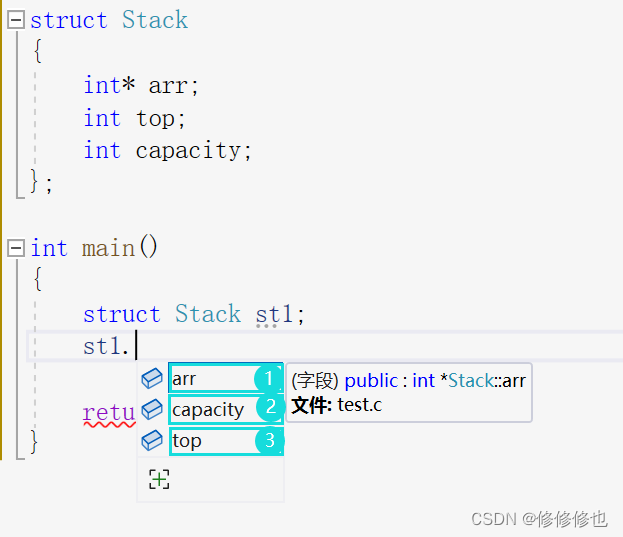 C语言结构体中只能定义变量,比如:之前在数据结构中,我们用C语言方式实现的栈,结构体中只能定义成员变量: