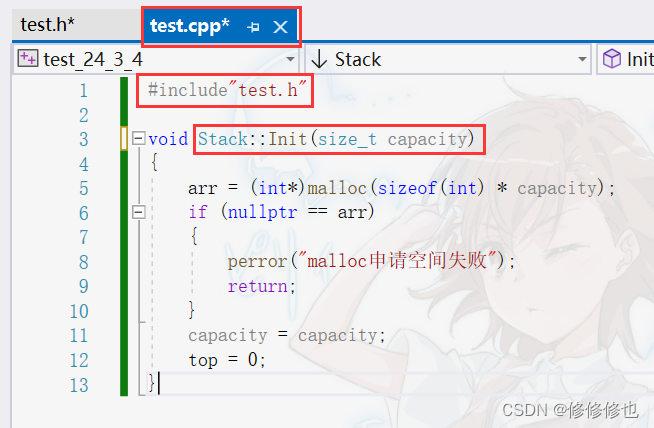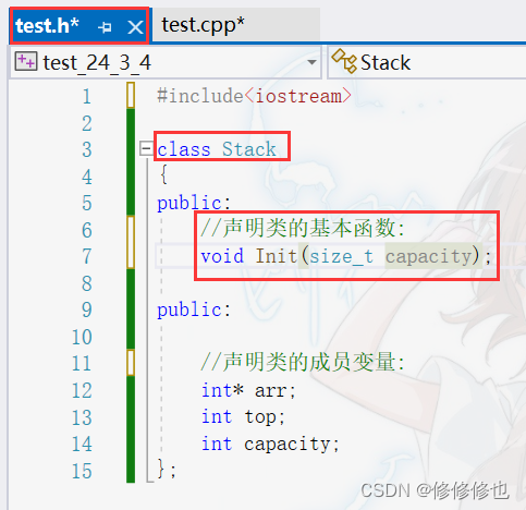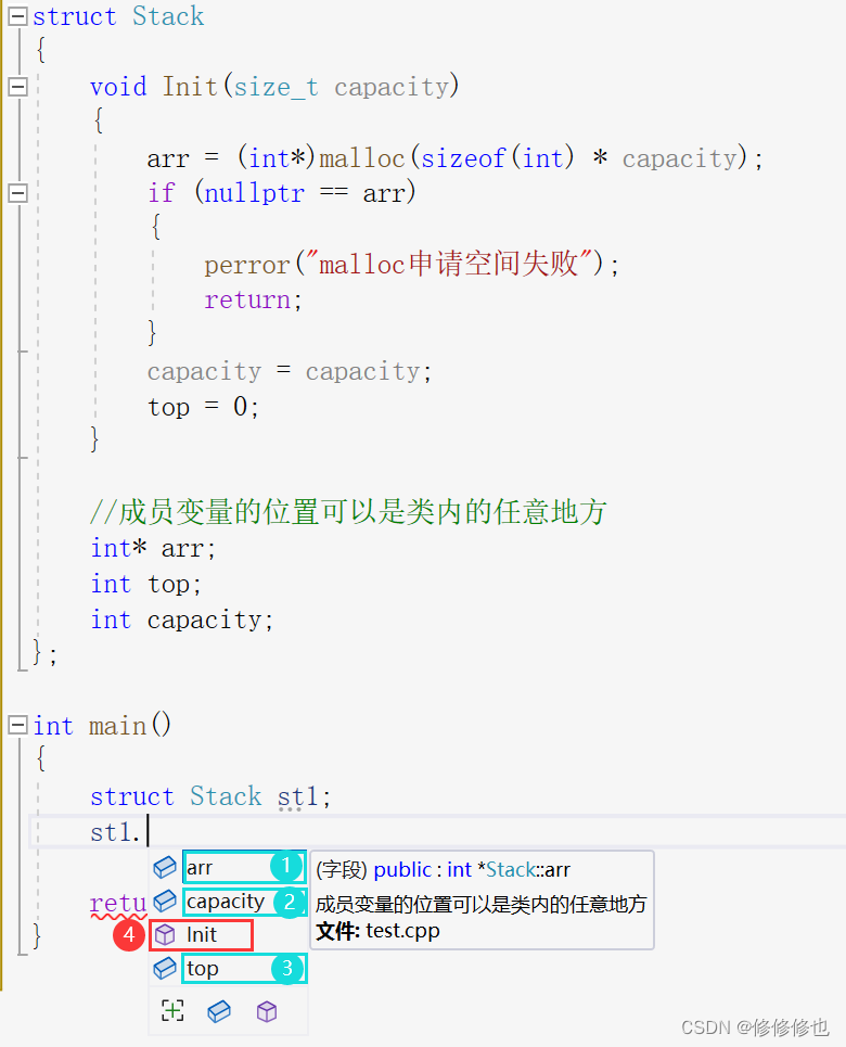 而在C++中,结构体内不仅可以定义成员变量,也可以定义函数。现在我们以C++方式实现栈,可以发现struct中也可以定义函数: