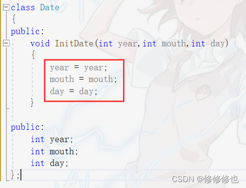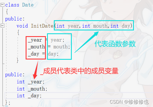 注意:为了防止在类中定义函数时像下面这样容易使成员变量和函数参数混淆:
