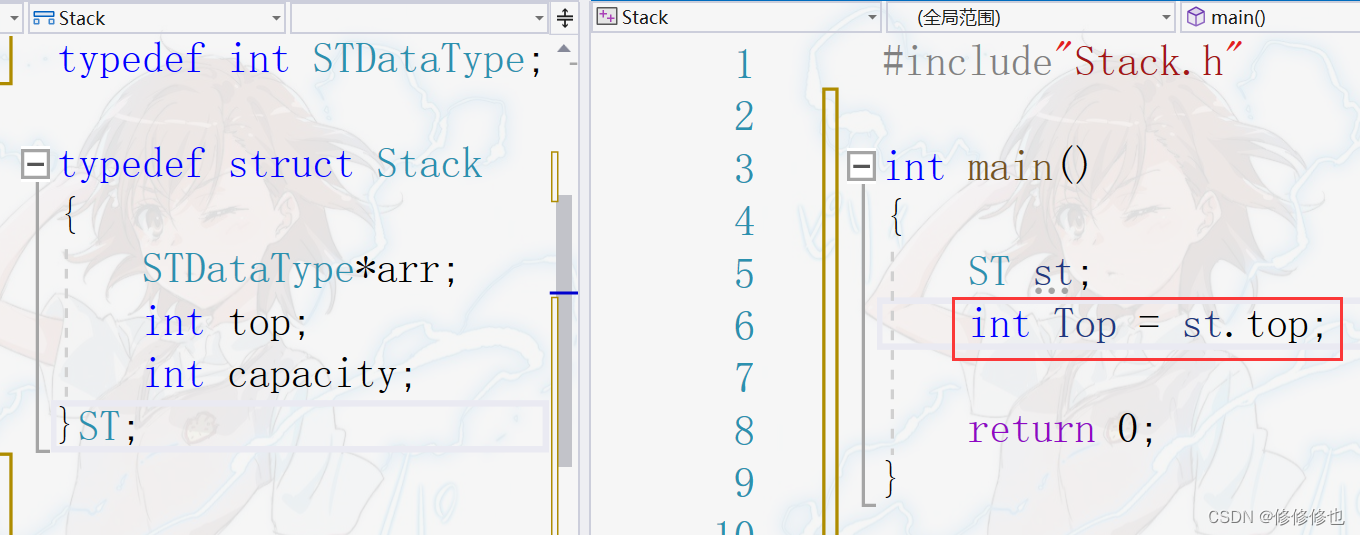如下,在栈程序中,使用者就没有通过取栈顶元素函数获取栈顶元素,而通过直接访问成员变量的方式访问了栈顶元素: