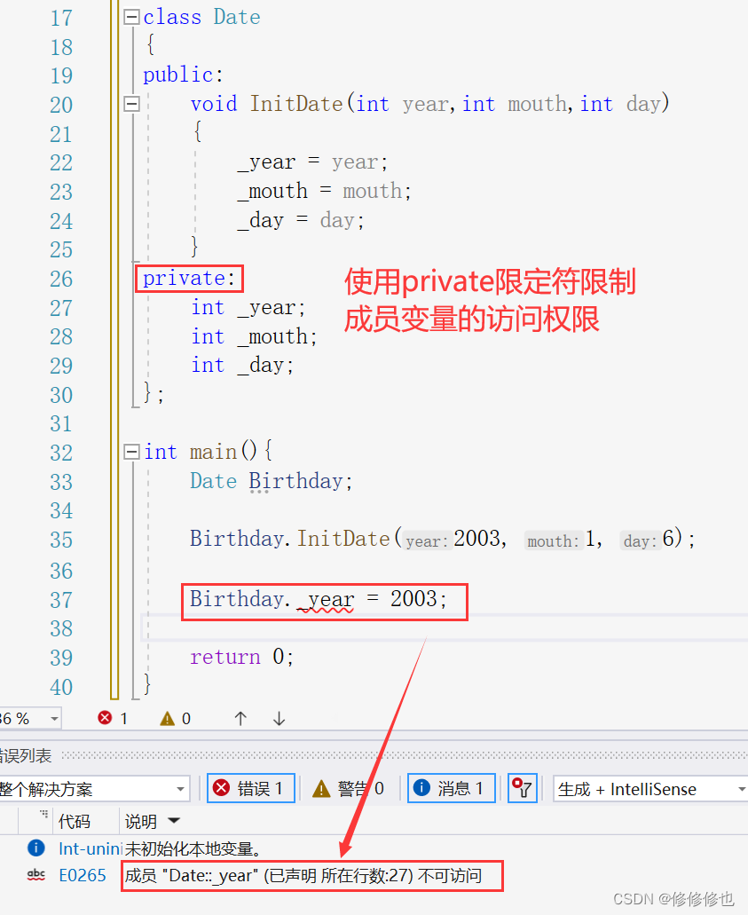 而在C++中,我们可以通过访问权限来隐藏对象内部实现细节,控制哪些方法可以在类外部直接被使用,而哪些方法在类外部不可以被使用。
