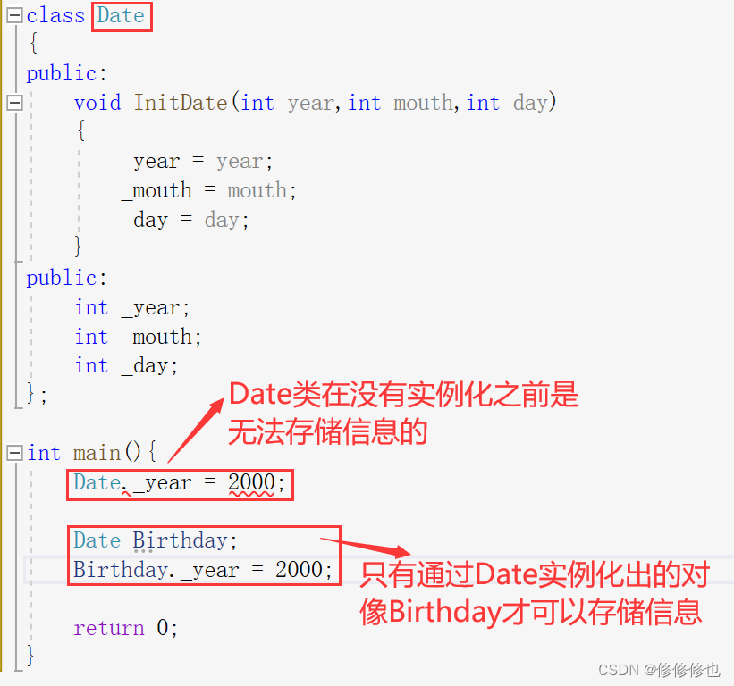 3. 打个比方来说,上面这个例子中的Date就类似于一个房屋建造的图纸,它规定了这个房屋建造多高,多宽,多长,以及各个地方的设计细节。但你如果不真正的将房子按照图纸建造出来,你就永远无法将家具之类的东西搬进房子里住,上图中使用Date类直接存储_year的数据就类似于要将现实世界的床搬进房屋设计图纸里住人。