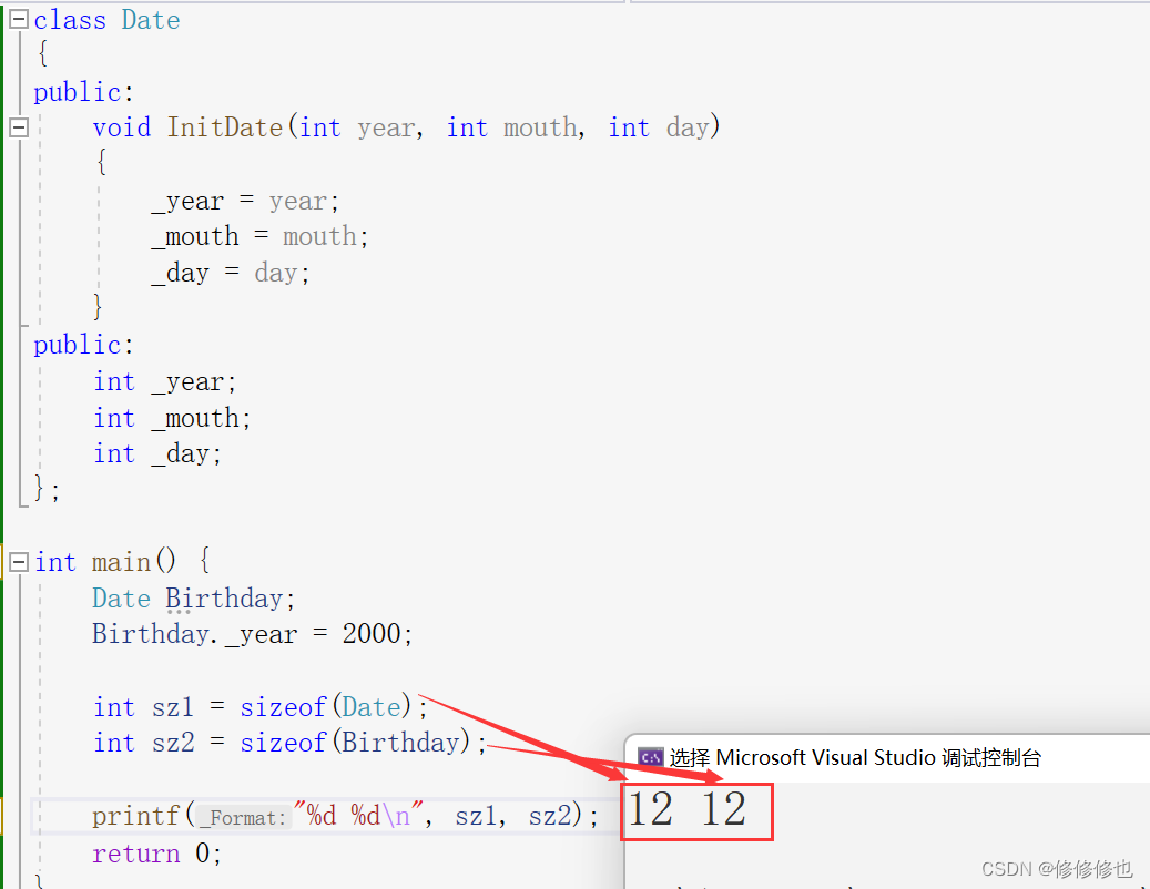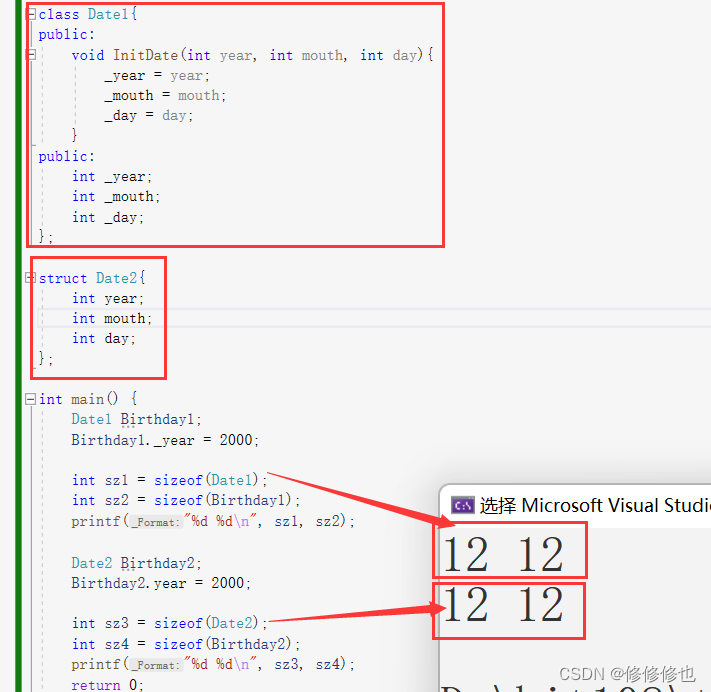 ` 如下,我们分别构建了一个类对象Date1,以及一个结构体对象Date2,分别计算他们的大小以及由它们创建的变量Birthday1,Birthday2的大小:
